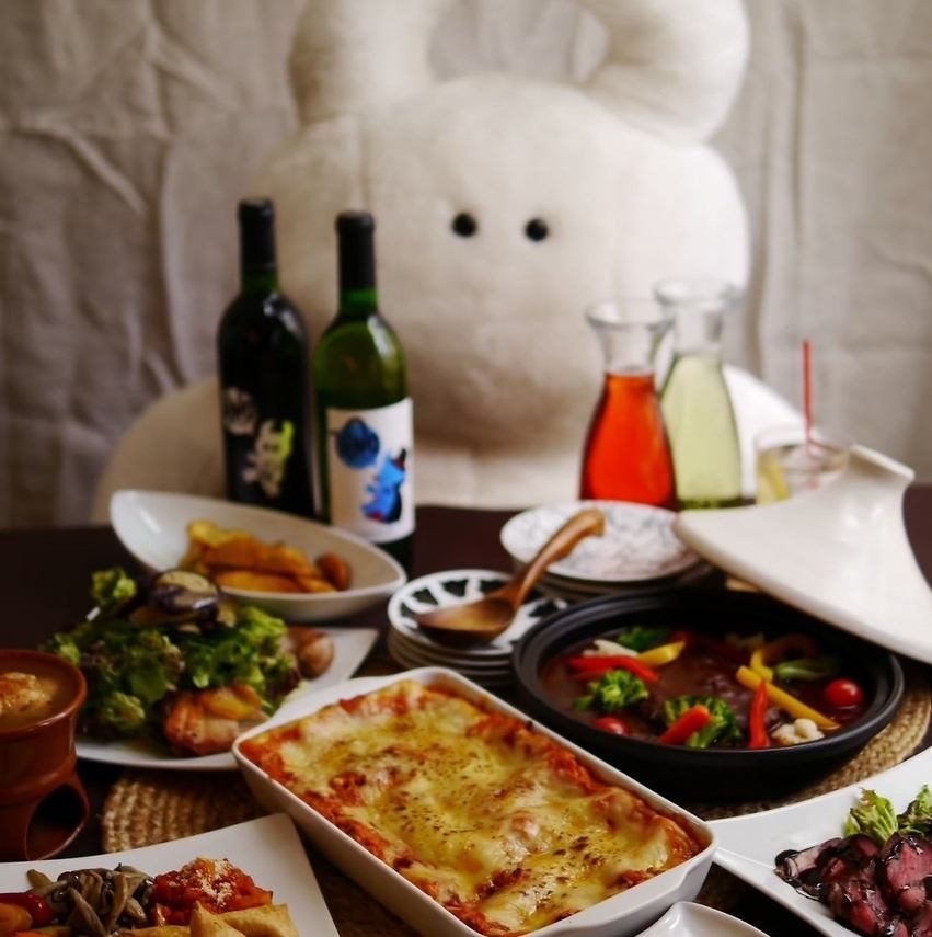 後ろのキャラクターは「ウアモウ」♪黒毛和牛使用のタジン鍋de煮込みハンバーグやローストビーフにパスタやビザが堪能できます♪※写真には一部現在扱いしてないメニューもあります。
